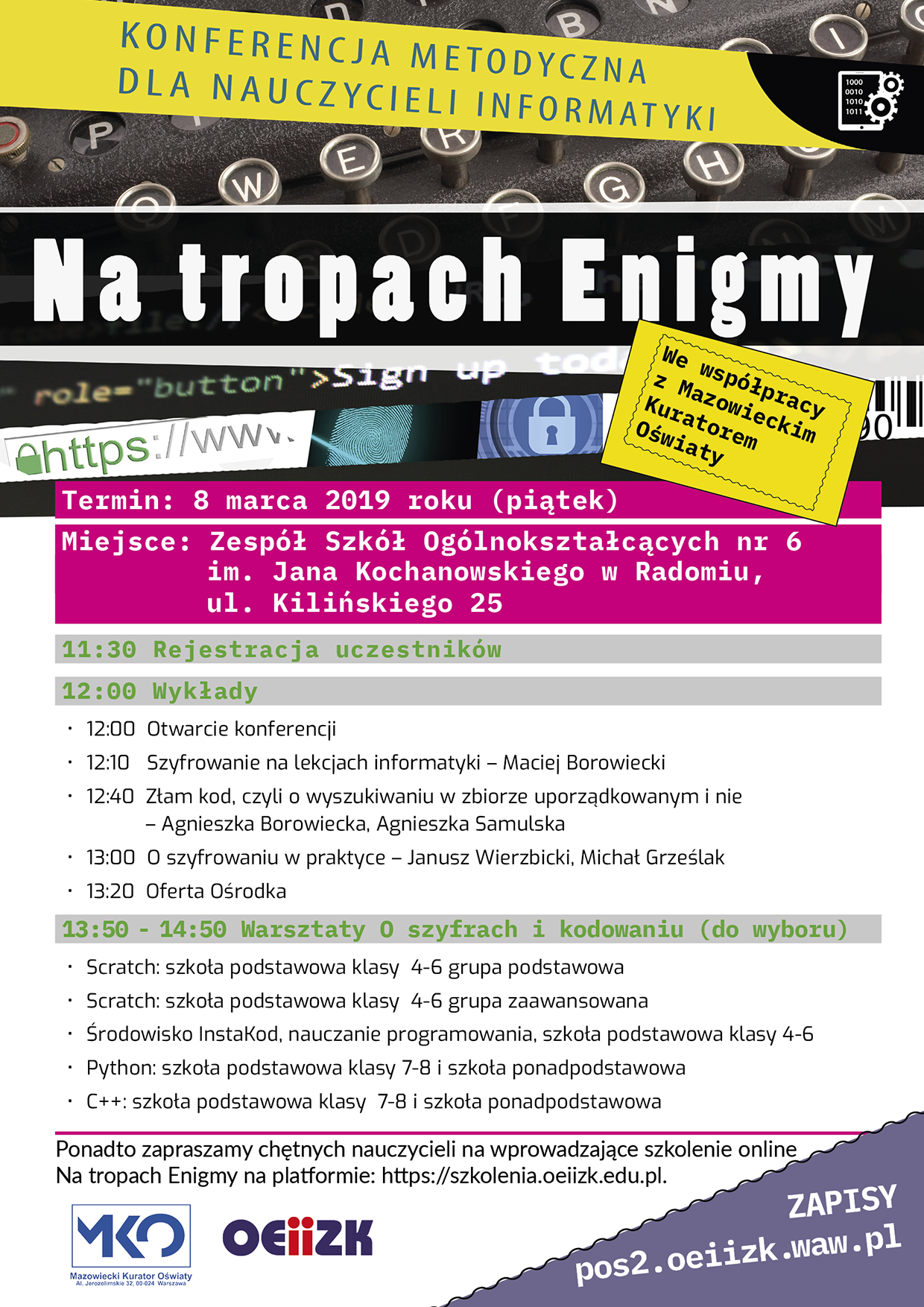 Konferencje organizowane są we współpracy z Mazowieckim Kuratorem Oświaty. Podczas wykładów zaprezentujemy ciekawe informacje dotyczące szyfrowania, łamania szyfrów i Enigmy, na warsztatach przedstawimy propozycje zajęć dla uczniów związanych z kryptologią.