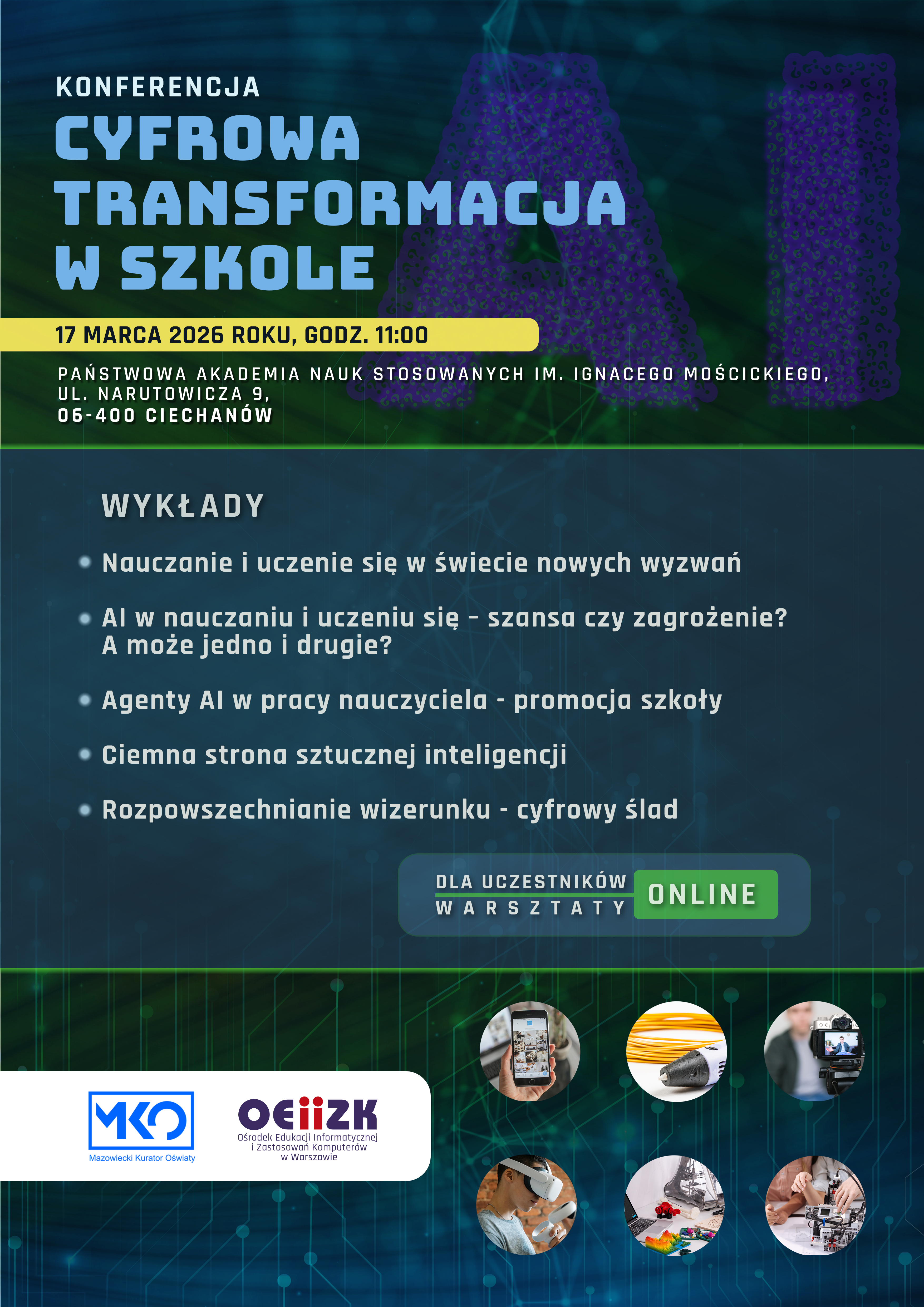 Ośrodek Edukacji Informatycznej i Zastosowań Komputerów w Warszawie oraz Mazowiecki Kurator Oświaty zapraszają nauczycieli różnych przedmiotów oraz różnych typów szkół na konferencję Cyfrowa transformacja w szkole, która odbędzie się 17 marca 2026 roku w godzinach 11:00-13:30 w Państwowej Akademii Nauk Stosowanych im. Ignacego Mościckiego przy ul. Narutowicza 9 w Ciechanowie.