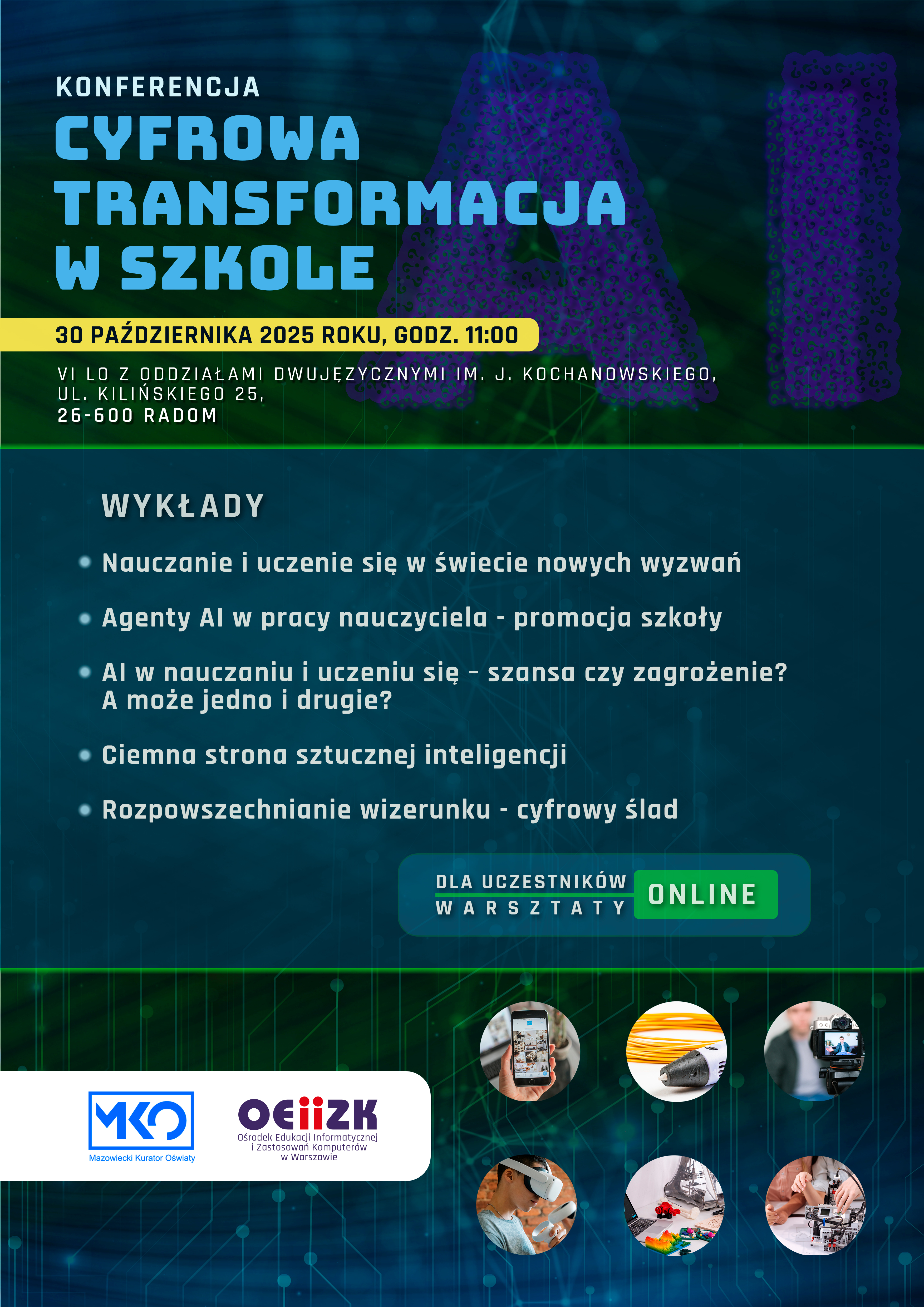 Ośrodek Edukacji Informatycznej i Zastosowań Komputerów w Warszawie oraz Mazowiecki Kurator Oświaty zapraszają nauczycieli różnych przedmiotów oraz różnych typów szkół na konferencję Cyfrowa transformacja w szkole, która odbędzie się 30 października 2025 roku w godzinach 11:00-13:30 w VI Liceum Ogólnokształcącym z Oddziałami Dwujęzycznymi im. J. Kochanowskiego przy ul. Kilińskiego 25 w Radomiu.