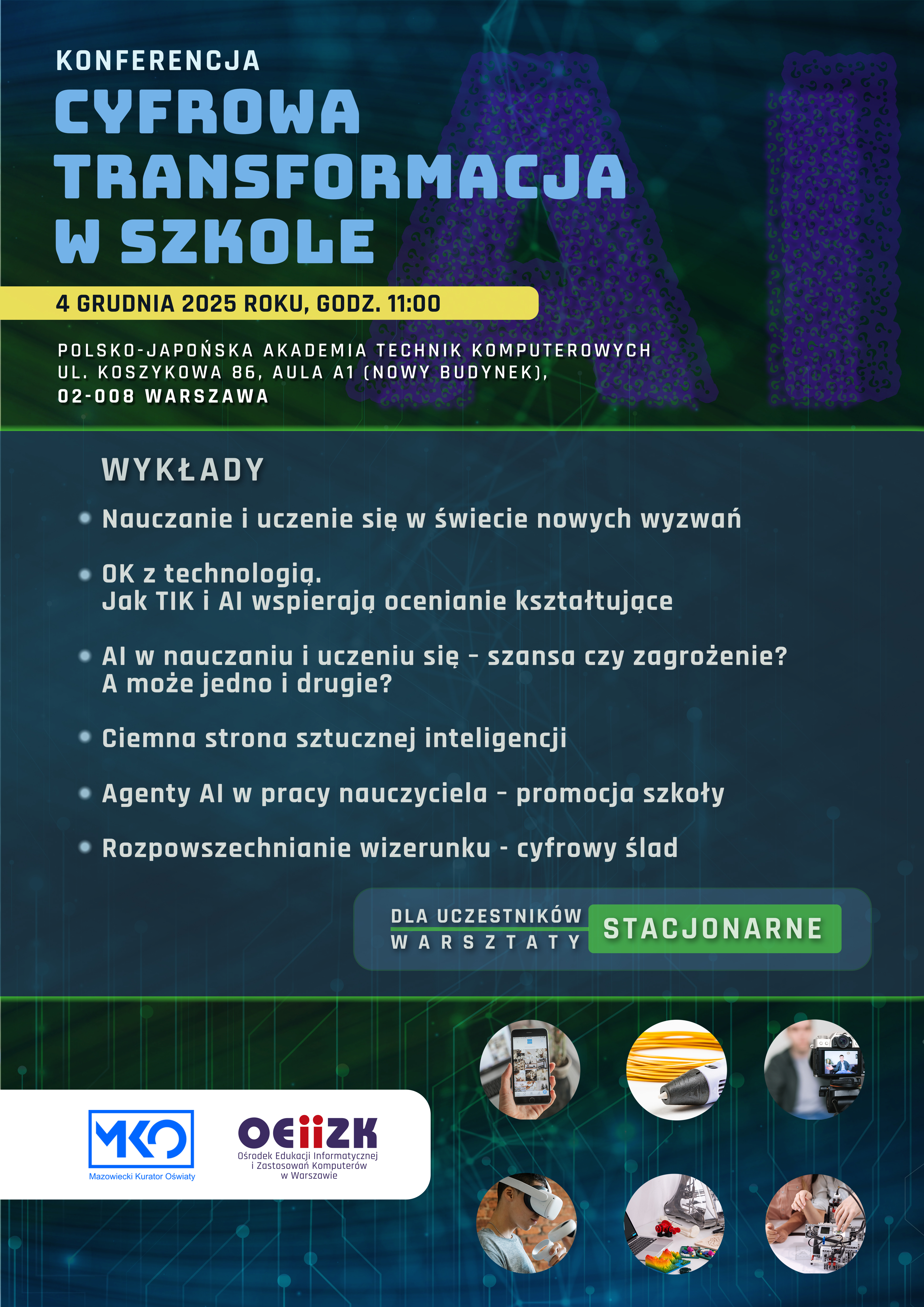 Ośrodek Edukacji Informatycznej i Zastosowań Komputerów w Warszawie oraz Mazowiecki Kurator Oświaty zapraszają nauczycieli różnych przedmiotów oraz różnych typów szkół na konferencję Cyfrowa transformacja w szkole, która odbędzie się 4 grudnia 2025 roku w godzinach 11:00-15:30 w Polsko-Japońskiej Akademii Technik Komputerowych, ul. Koszykowa 86, aula A1 (nowy budynek) w Warszawie.