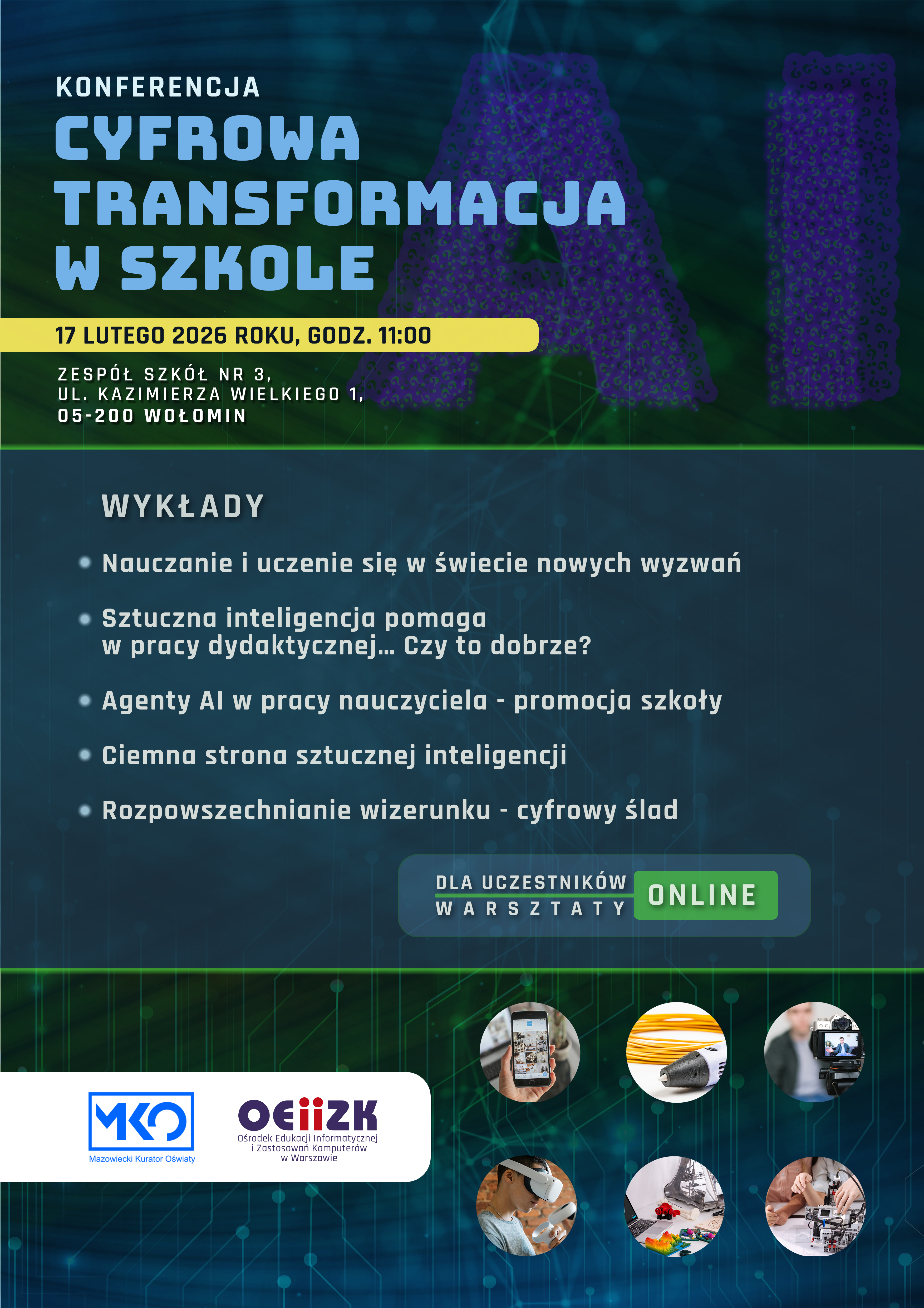 Ośrodek Edukacji Informatycznej i Zastosowań Komputerów w Warszawie oraz Mazowiecki Kurator Oświaty zapraszają nauczycieli różnych przedmiotów oraz różnych typów szkół na konferencję Cyfrowa transformacja w szkole, która odbędzie się 17 lutego 2026 roku w godzinach 11:00-13:30 w w Zespole Szkół nr 3 przy ul. Kazimierza Wielkiego 1 w Wołominie.